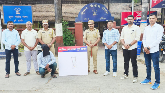 दि. २८ एप्रिल रोजी रवींद्र राजगुरू हा घोडेगाव फाटा जुन्नर येथे येणार असल्याचे गोपनीय बातमीदारा मार्फत समजल्याने सदर ठिकाणी सापळा लावून,त्यास गुन्हे शाखेच्या पथकाने ताब्यात घेतले.दरम्यान कल्पना राजगुरू ह्या वयस्कर असून घरी एकट्याच असल्याचे लक्षात आल्याने,त्याने सदरचा गुन्हा केल्याची कबुली दिली आहे. त्याच्या ताब्यातून चोरीस गेलेले मंगळसूत्र हस्तगत करण्यात आले आहे. सदर आरोपीस जुन्नर पोलिसांच्या ताब्यात देण्यात आले असून, या घटनेचा पुढील तपास पोलीस उपनिरिक्षक रघुनाथ शिंदे हे करत आहेत.