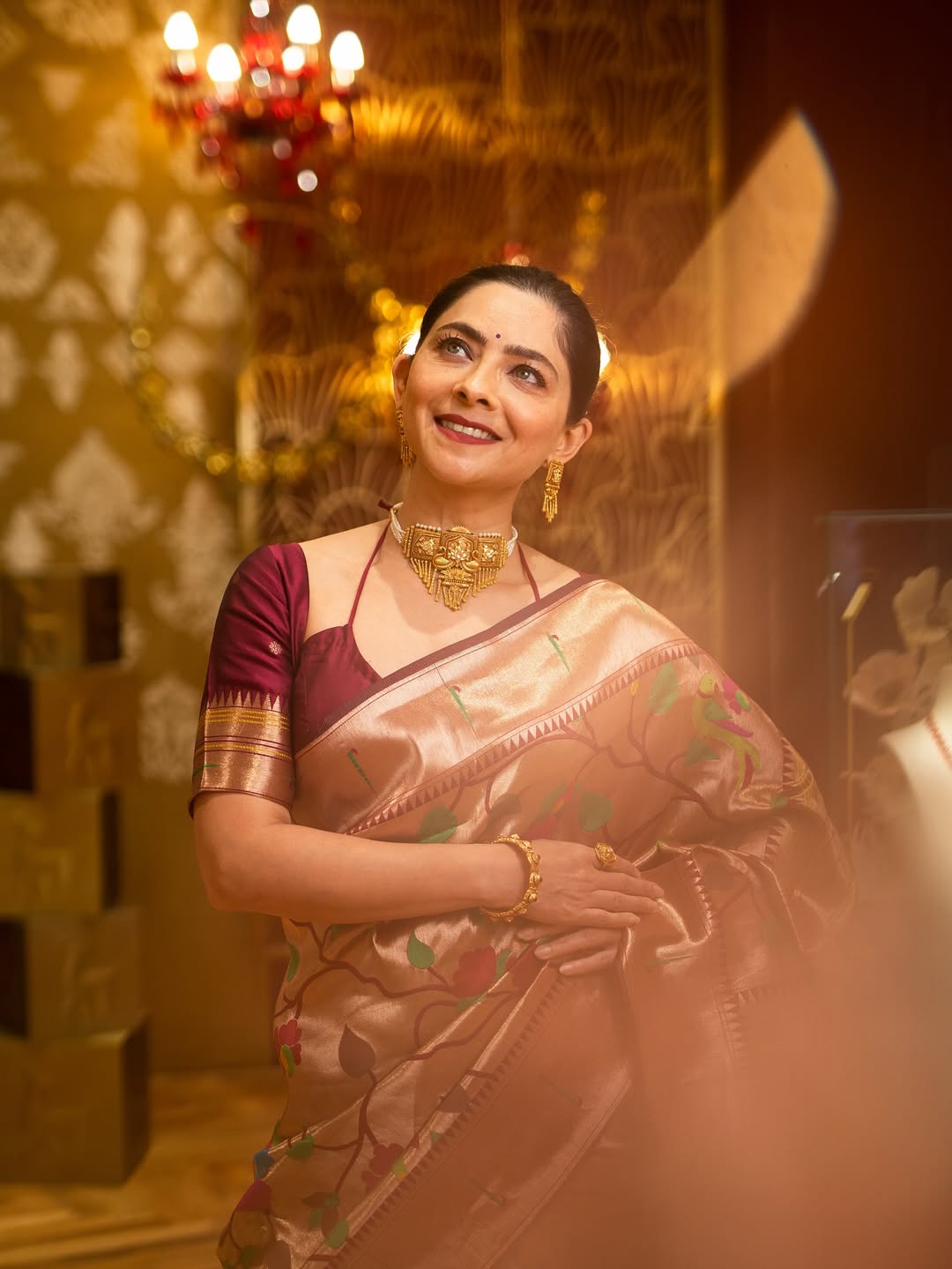 या फोटोशूटसाठी सोनालीने सोनेरी रंगाची मुनिया पैठणी साडी नेसली आहे.